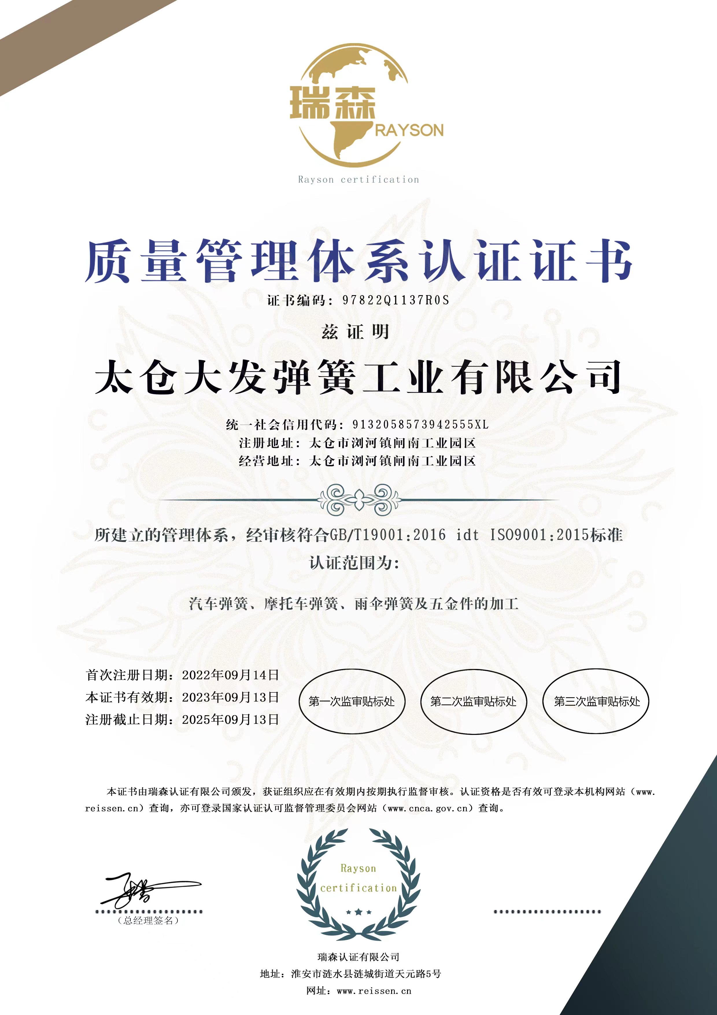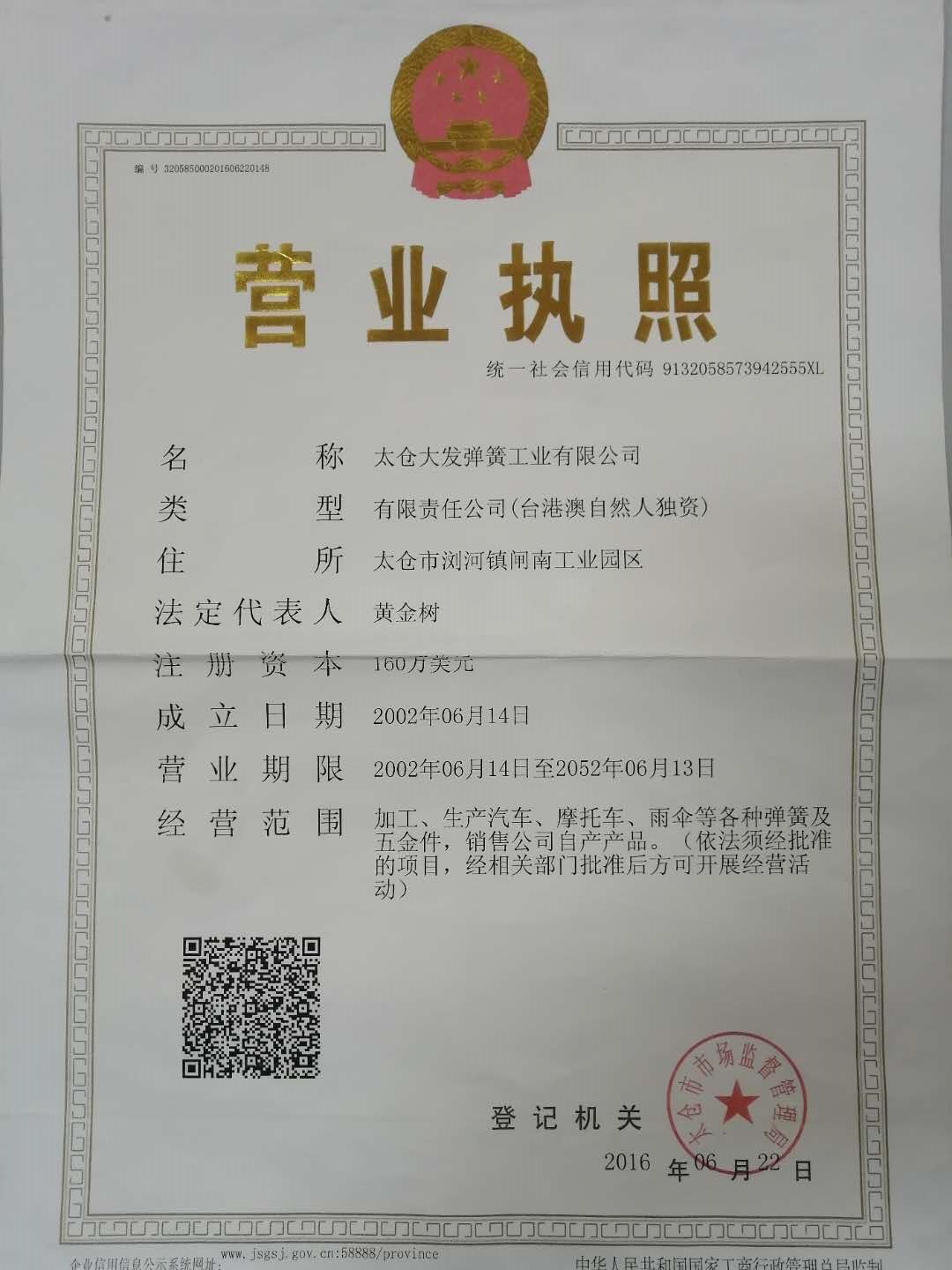 太倉大發(fā)彈簧工業(yè)有限公司由黃金樹先生于1967年始創(chuàng)于臺灣,是一個集雨傘、電子、五金機械、自行車、摩托車、汽車等的彈簧配件生產、加工、輔助設計服務的綜合性企業(yè),其中1990年創(chuàng)辦的廈門大發(fā)彈簧公司、2000年創(chuàng)辦的深圳大發(fā)彈簧公司、2002年創(chuàng)辦的太倉大發(fā)彈簧公司均位于經濟發(fā)展地區(qū),地理位置佳。我們憑借在彈簧制造業(yè)的多年豐富知識與技術,并著眼于以客戶為導向,秉持“以人為本,以質為先,以客為主,持續(xù)創(chuàng)新”的經營理念,強化競爭優(yōu)勢。公司導入ISO9001: 2000質量管理體系,執(zhí)行ISO14000:2000管理方式,倡導安全、高質量、高素質的生產。